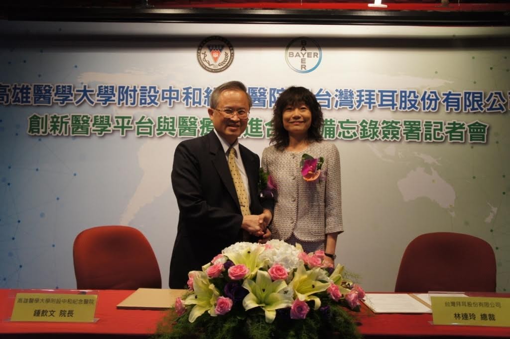 高雄醫學大學附設中和紀念醫院與台灣拜耳股份有限公司,今(18)日簽訂「醫療促進合作備忘錄」,未來高醫可透過台灣拜耳的創新研究平台,就已上市藥物、或實驗中藥物提出新適應症的研究計畫,通過遴選獲得相關研究經費與支援,期望在現有適應症外,研究出更安全有效又先進的新治療,幫助更多患者。