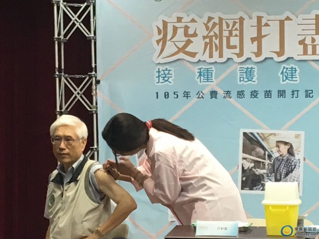 ▲衛福部長挽袖來挨針!105年度公費流感疫苗今起開打。(圖/疾管署提供)
