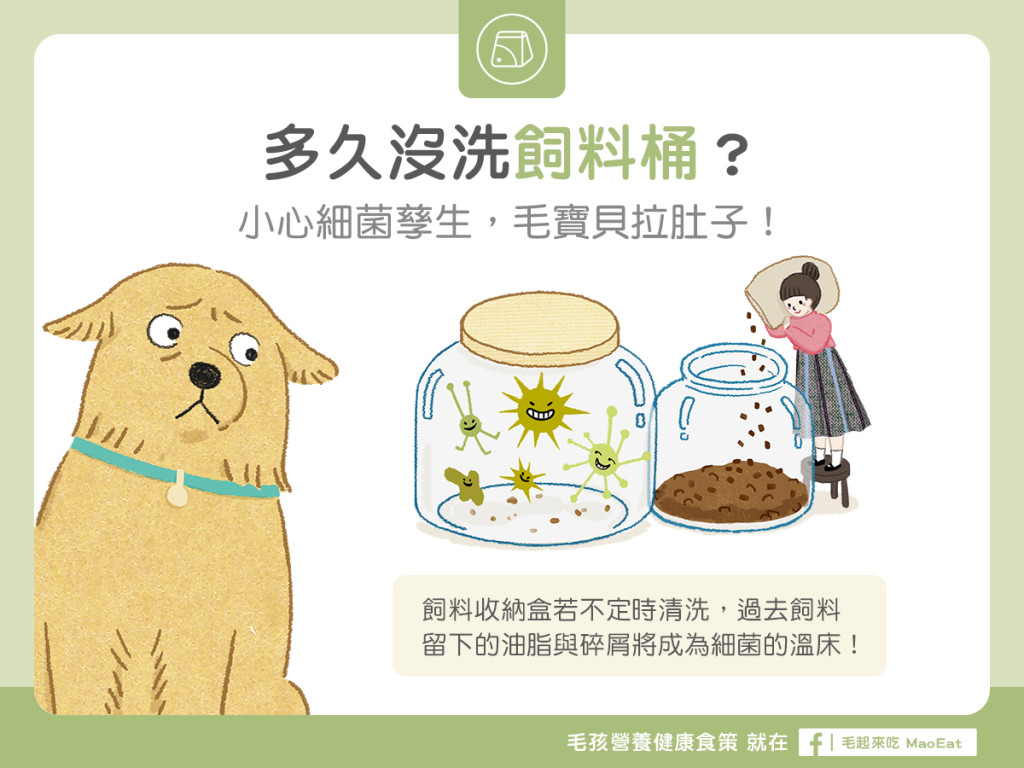 飼料對細菌來說是養分的最佳來源,尤其台灣潮濕炎熱的氣候更容易孳生細菌。如果飼料桶沒有定時清潔,過去飼料留下的油脂與碎屑將成為細菌的溫床!不但容易汙染新飼料、更可能導致毛孩厭食或拉肚子喔!