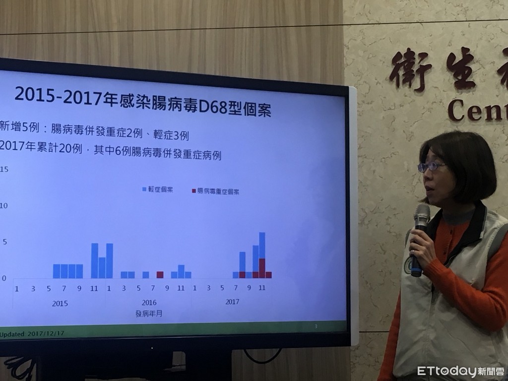 過往國內比較常見的腸病毒包含多以輕症表現的克沙奇A型,以及容易導致重症的腸病毒71型,至於D68型從2015年納入監測以來,僅有十幾例輕症檢出。不過,今年下半年不但首次確認有D68型併發重症病例,到現在已陸續確認6例的重症個案,疾管署上週特別召開專家會議討論因應對策。