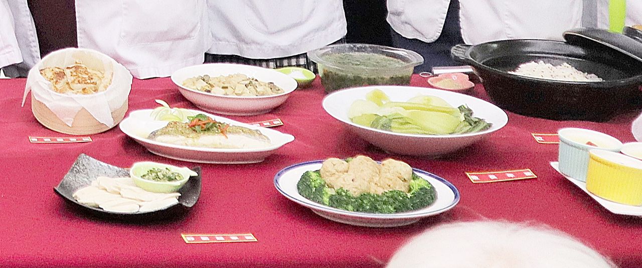 第五道是「金玉滿堂鈣蒸蛋」,將全穀雜糧類及乳品類等國人攝取量不足的食材融入菜餚當中,不但可滿足視覺享受,更可讓長者汲取足夠營養;第六道是「紅豆奶香糕」,使用大量奶粉入菜,能提高長者鈣質攝取。第七道是「金玉滿堂鈣蒸蛋」,在白飯中增加紅藜麥、加入過篩後的地瓜等增加全穀雜糧類攝取量;第八道是自製的「香煎蘿蔔糕」,利用白蘿蔔比例增加等方式,可增加長者纖維質攝取,兼顧營養成分與纖維質攝取。