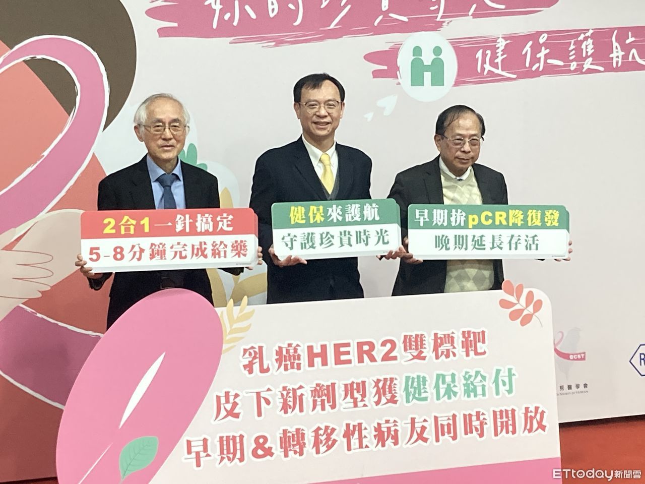 ▲健保署長石崇良(中)出席乳房醫學會「HER2乳癌雙標靶皮下針劑納健保給付」記者會,左為乳房醫學會理事長陳守棟,右為高醫大教授侯明鋒。(圖/記者洪巧藍攝)