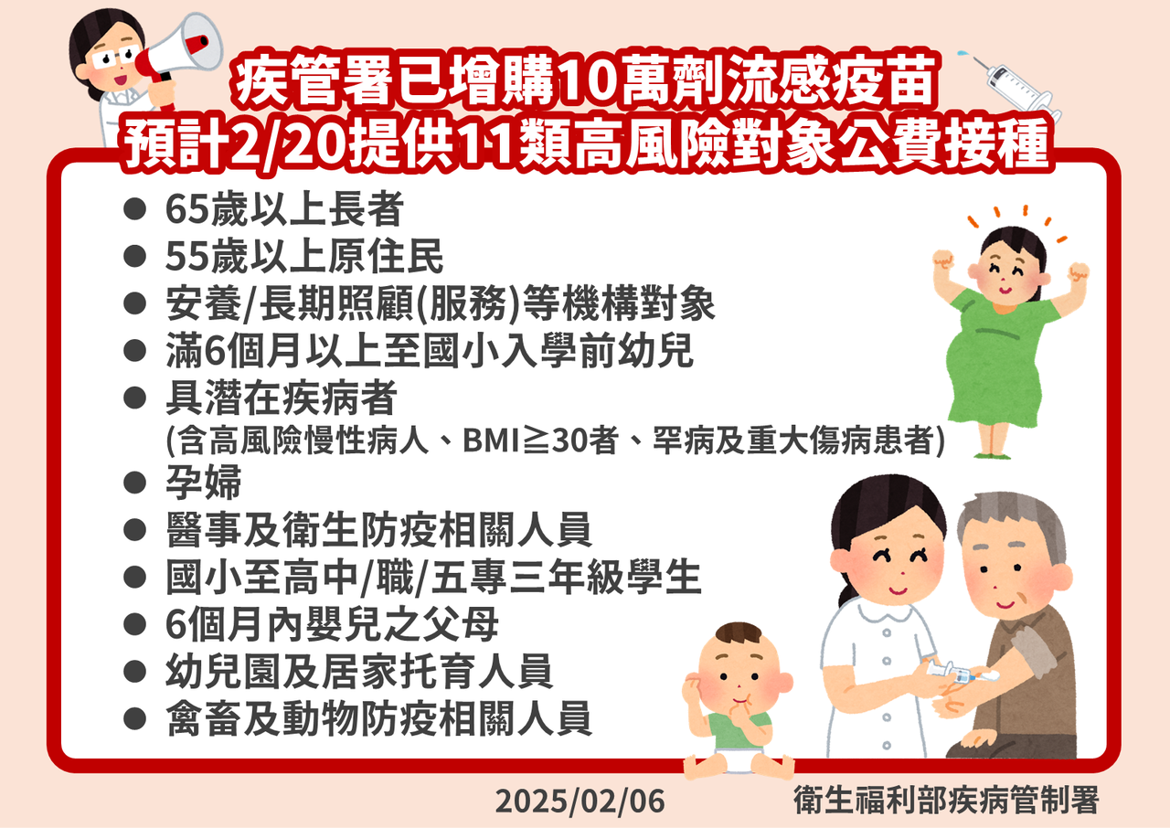 疾管署今日表示,考量農曆春節後民眾對於流感疫苗接種需求大增,公費流感疫苗即將用罄,又時值流感疫情高峰期,為提升較高風險族群接種率,減少重症與死亡,今日經衛生福利部提報行政院院會同意緊急增購10萬劑流感疫苗。