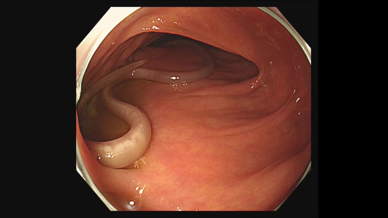 收治個案的大林慈濟肝膽腸胃內科醫師曾勗桓指出,這位女性來到診間主訴近日肚子脹,體重逐漸減輕,先安排胃鏡及超音波檢查,都未發現問題。進一步經由大腸鏡檢查,赫然在乙狀結腸發現兩條白色蠕蟲,將蟲子抓出送病理科檢驗,得知竟是長約20公分左右的蛔蟲。