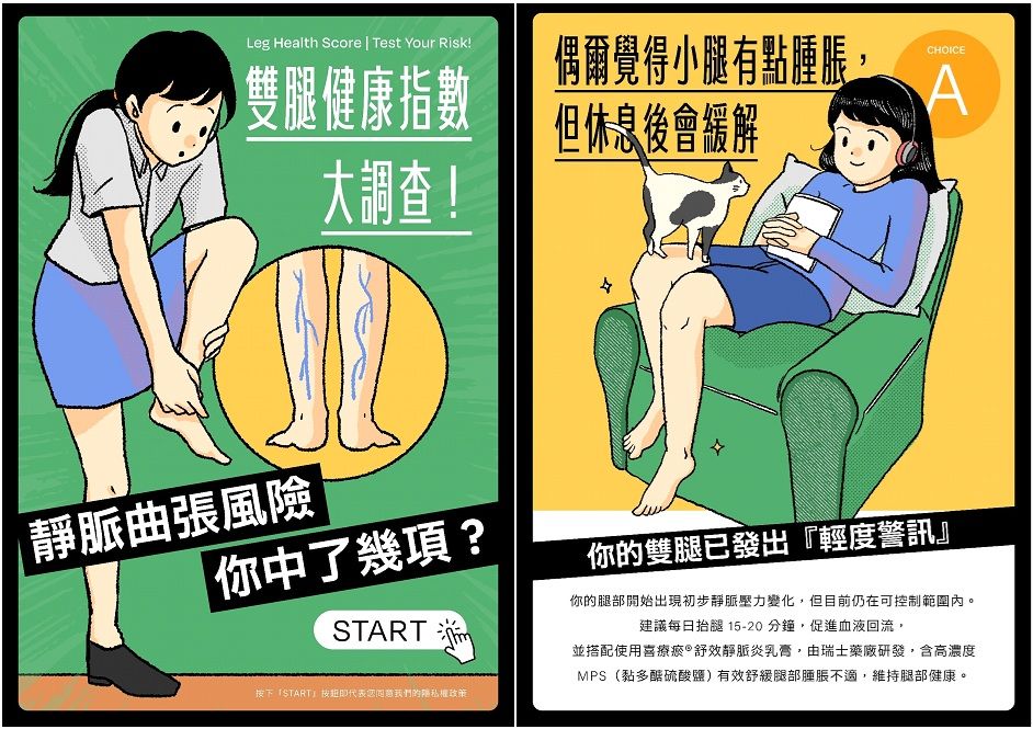 你是否長時間站立或久坐?或經常穿著高跟鞋、緊身衣物?這些都會提高靜脈炎與靜脈曲的風險,一旦有前兆,千萬別輕忽,及早發現、及時護理才能避免病情加重。現在就來快速檢測自己的腿部狀態,從4個選項中選出最符合自身狀態,看看雙腿健康狀況如何,是輕度警訊、健康警報,還是已經有前期、甚至是明顯徵狀? 先確認腿部狀態才能找到最適合的護理方式!