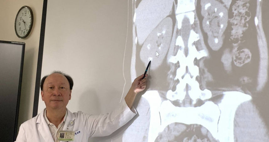 ▲臺中醫院泌尿科主任朱朗軒說明,患者因副甲狀腺亢進導致鈣質代謝失衡,兩顆腎臟沉積大量小石頭宛如「滿天星」。(圖/院方提供)