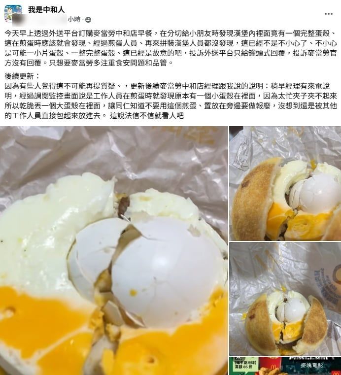 該名網友昨日在臉書社團「我是中和人」貼出照片表示,「今天早上透過外送平台訂購麥當勞中和店早餐,在分切給小朋友時發現漢堡內裡面竟有一個完整蛋殼。」他認為,照理說在煎蛋時應該就會發現,經過煎蛋人員、再來拼裝漢堡人員都沒發現,「這已經不是不小心了,這已經是故意的吧!」