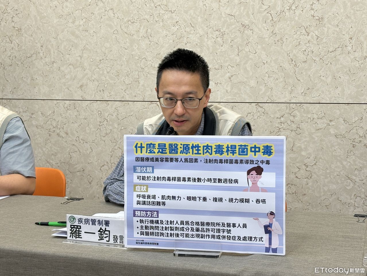 疾管署副署長羅一鈞表示,注射肉毒桿菌毒素造成之中毒,可能於注射後數小時、數日或數周發病,症狀包括疲倦、視力模糊、瞳孔放大、眼瞼下垂或由上到下肢體無力等神經學症狀,嚴重時可能發展為呼吸無力衰竭,甚至死亡。