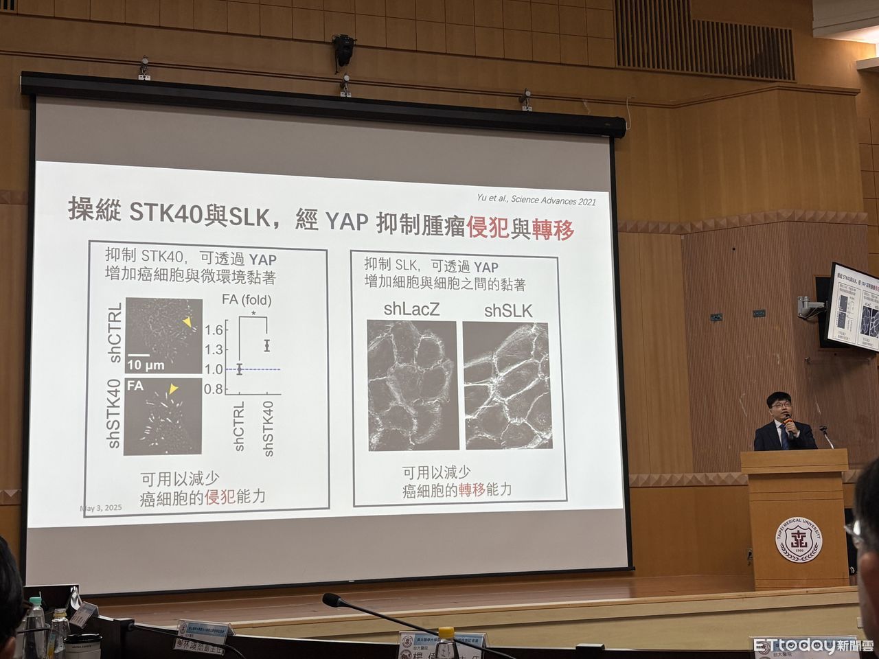 再於北醫大醫師黃奕文協助下,將此結果於肝癌病人數據庫驗證,確認 YAP、 STK40 與 SLK 三個基因的表現量,與肝癌病人的存活密切相關;並進一步以實驗確認 STK40 與 SLK 可直接控制 YAP 活性,影響肝癌細胞的惡性度。