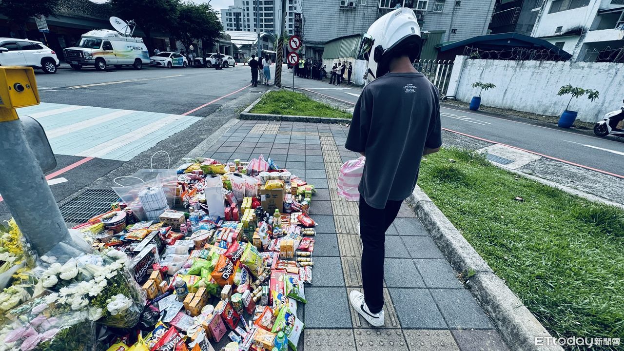 ▲民眾紛紛至車禍現場獻上鮮花與零食 。(圖/記者陳以昇攝)