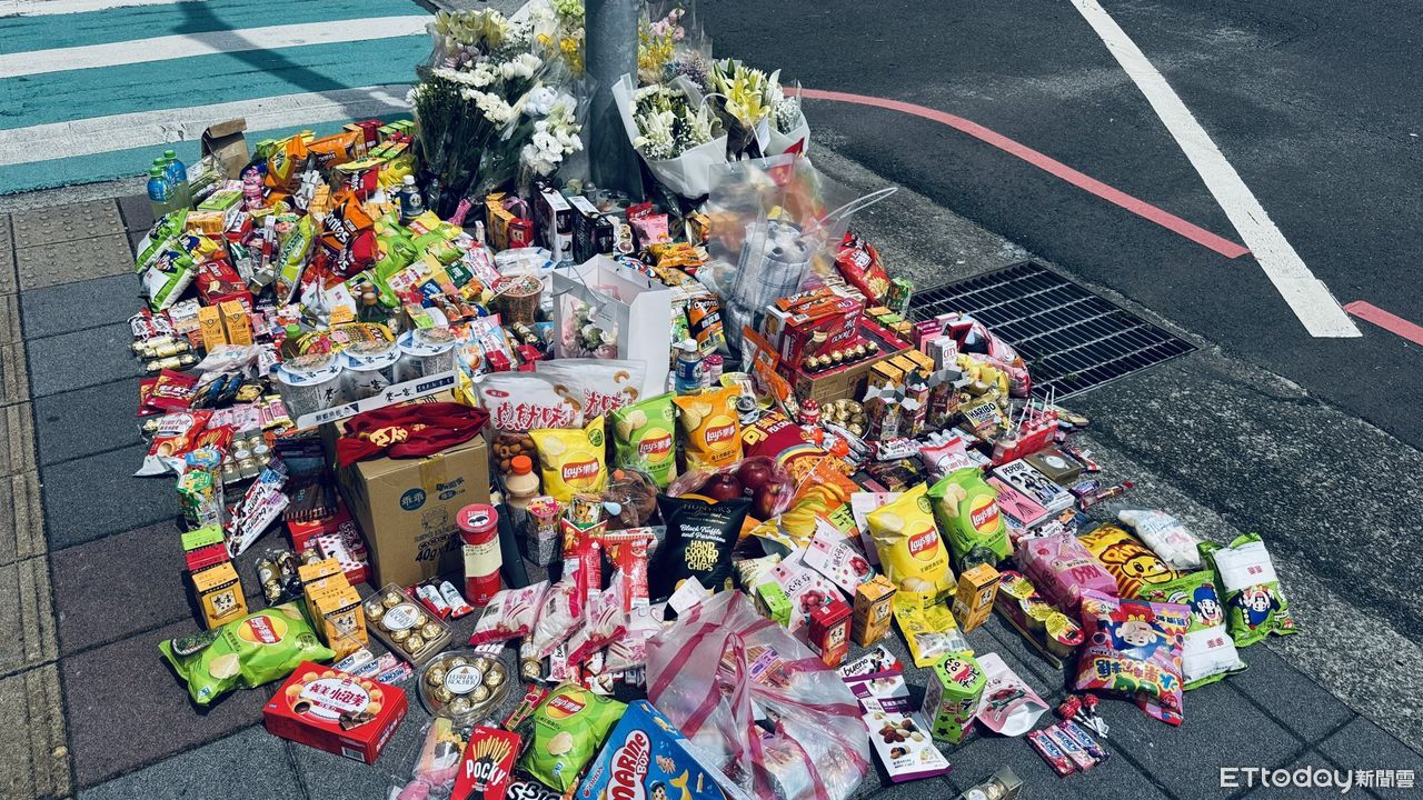 ▲三峽北大國小旁日前發生汽車駕駛衝撞致3死12傷慘劇,不少民眾至現場獻上鮮花與零食 。(圖/記者陳以昇攝)