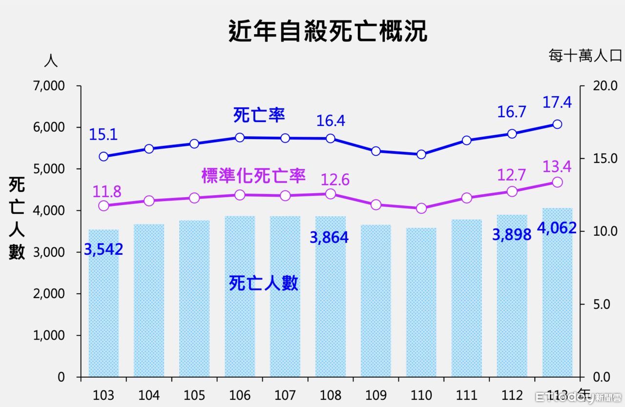 根據統計,113年自殺死亡人數有4,062人,比112年增加164人,進一步分析發現,113年0至14歲、65歲以上自殺死亡人數較112年下降,其餘年齡層均呈上升。