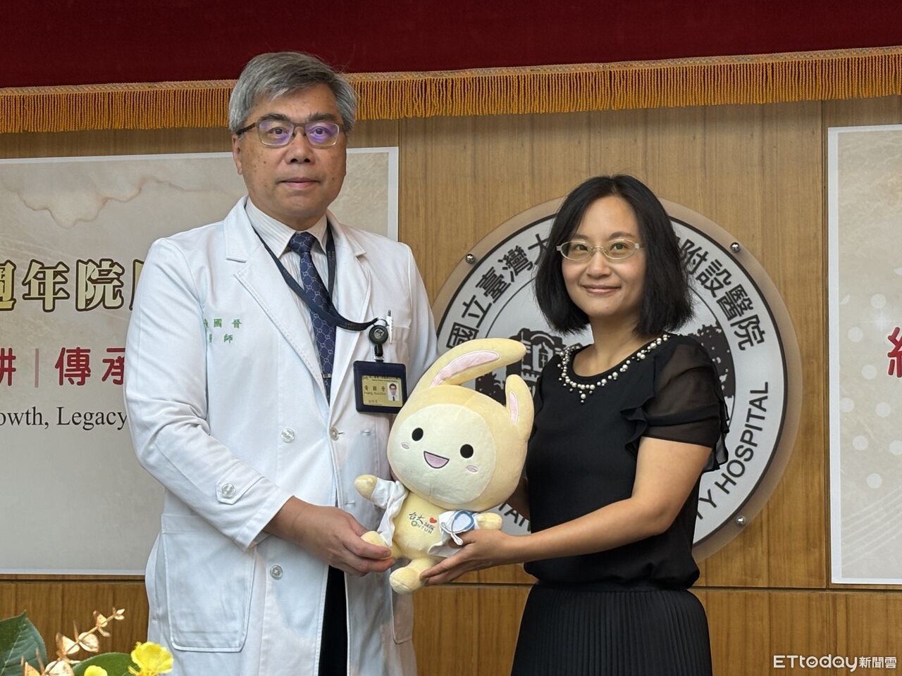 ▲連純慧(右)從台大副院長黃國晉(左)手中獲贈台大醫院吉祥物醫寶。(圖/記者洪巧藍攝)