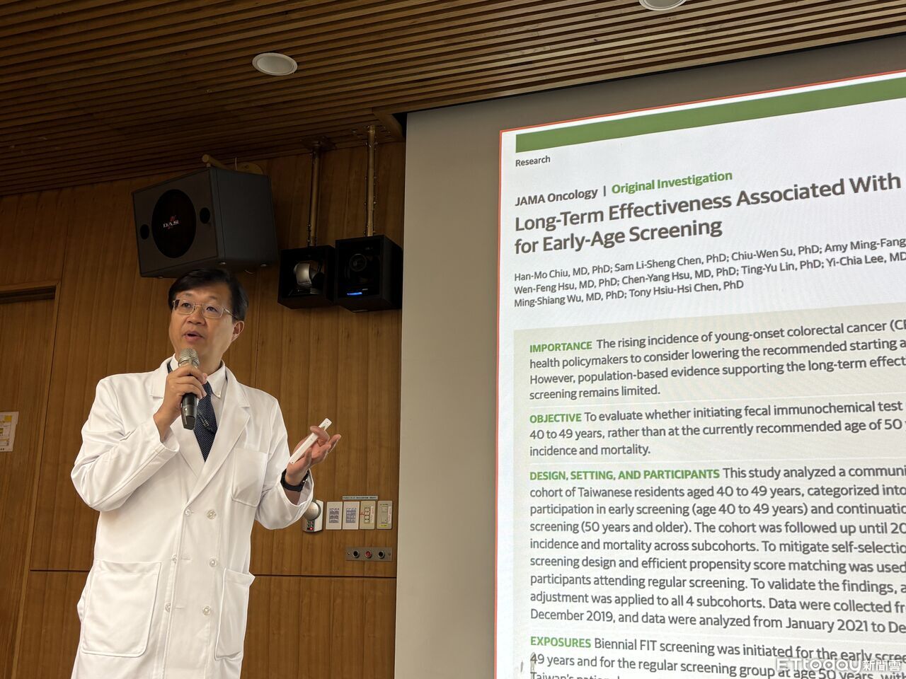 邱瀚模說明結果,早期篩檢組相較對照組的大腸癌發生風險下降21至23%,死亡風險則下降39至42%。若提早啟動篩檢,每檢查1,548人即可預防一例大腸癌,顯著優於從50歲開始檢查所需的2,079人。