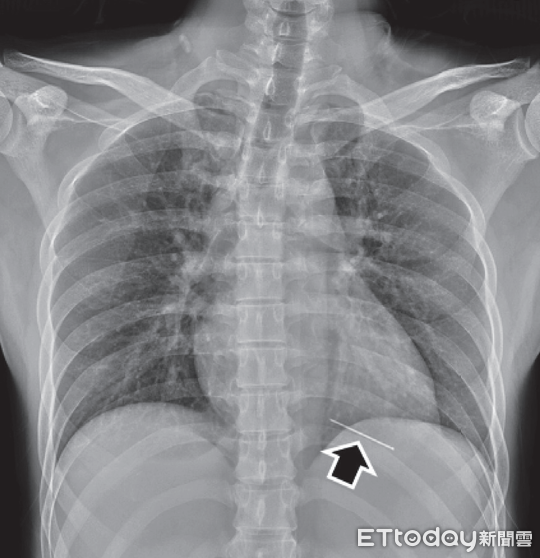 ▲男子遭釘槍射入左心室,從X光片可見有異物緊臨心臟 。(圖/賴雨濃醫師提供,下同)