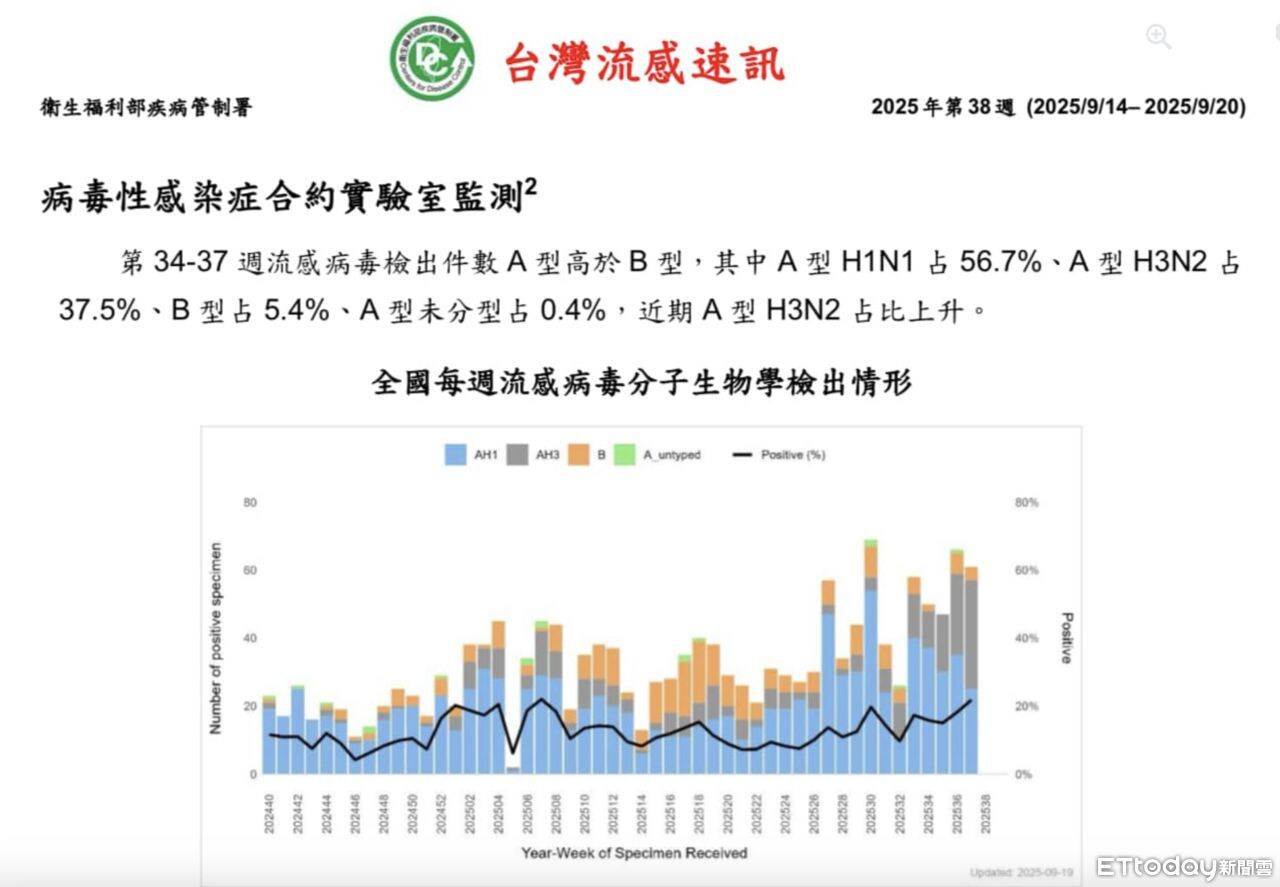 此外,目前國內上升的流感同時也伴隨著「流行型別轉換」,A(H3N2)流感已要超車A(H1N1),符合世衛年初觀察到H3N2已變也因此更換疫苗株,去年H3N2疫苗株是泰國株、今年換成克羅埃西亞株,因此最近得過A流的人,還是可能因為流行型別轉換後又再得到不同的A流,建議還是要打10月最新的流感疫苗、取得最新保護。