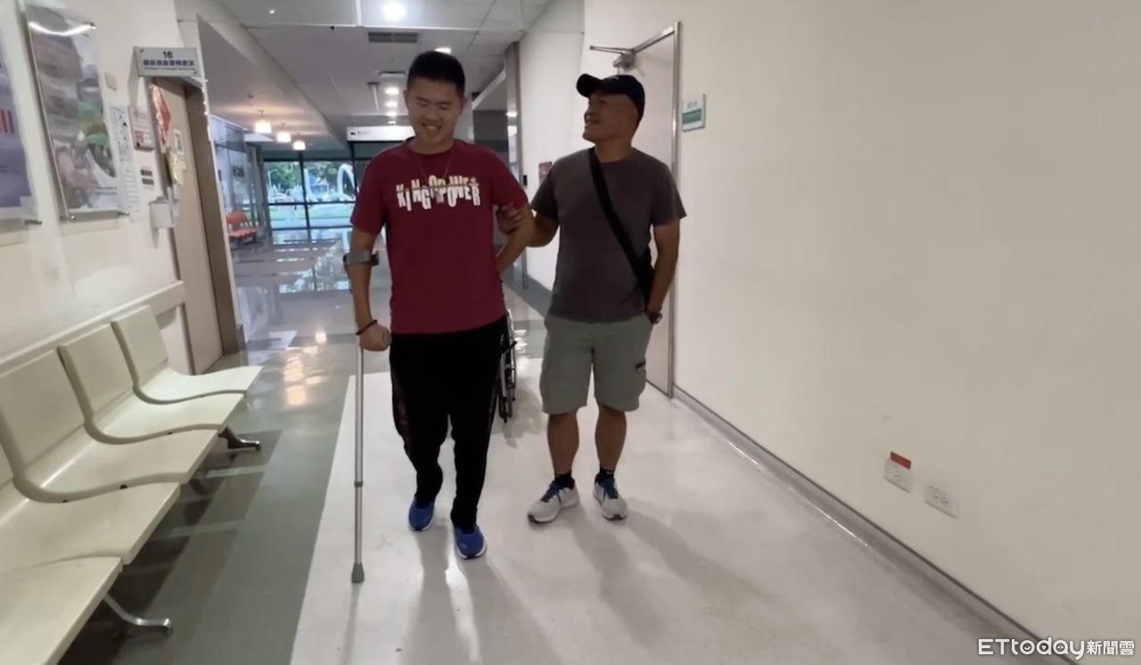 ▲秦良丰(左)奇蹟生還,並透過積極復健,得以不必長時間倚靠輪椅,能自力行走。(圖/記者吳奕靖翻攝)