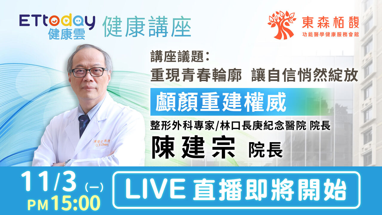 《ETtoday健康雲》與「東森栢馥功能醫學健康服務會館」今(3日)下午2時30分舉辦健康講座,主題為「重現青春輪廓,讓自然悄然綻放」,邀請國內顱顏重建權威、林口長庚紀念醫院院長陳建宗醫師擔任主講人,與東森VIP會員分享醫學知識,《ETtoday健康雲》將直播講座精彩內容。