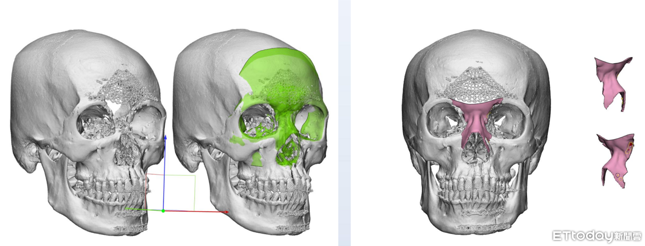 針對手術設計,徐國峰說,醫療團隊除遵循「Replaced like with like」原則,取用最接近的組織,來修補缺損的部位,並透過3D虛擬模型重建缺損額鼻骨,同時依面部比例設計植入物角度及長度,使五官更趨自然。