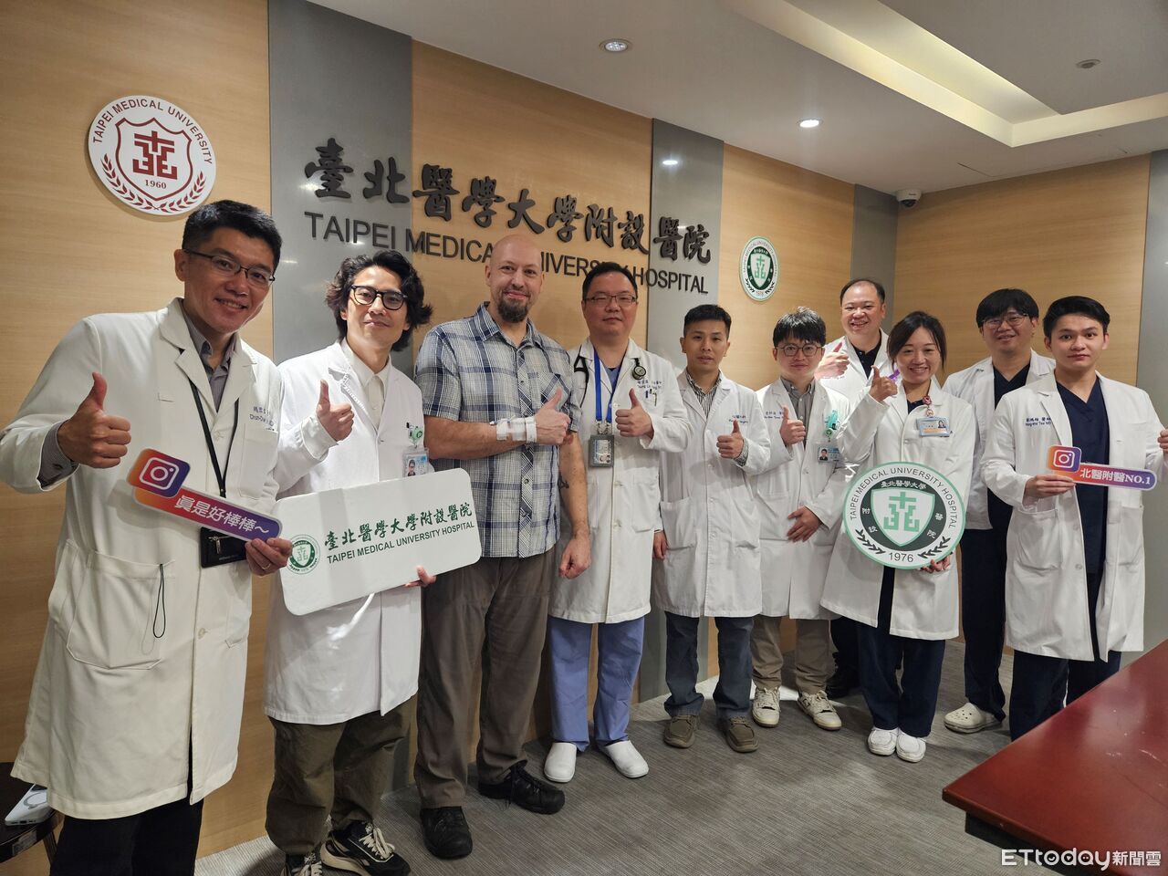 ▲Atom(左三)日前發生急性心肌梗塞,所幸民眾及時伸援,加上北醫團隊搶救得宜,得以康復返家 。(圖/北醫提供)
