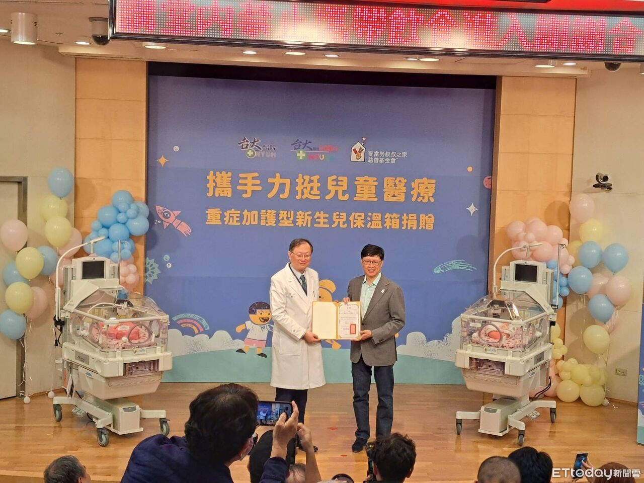 ▲余忠仁(左)代表台大接受「麥當勞叔叔之家慈善基金會」捐贈2台重症加護型新生兒保溫箱。(圖/記者邱俊吉攝)