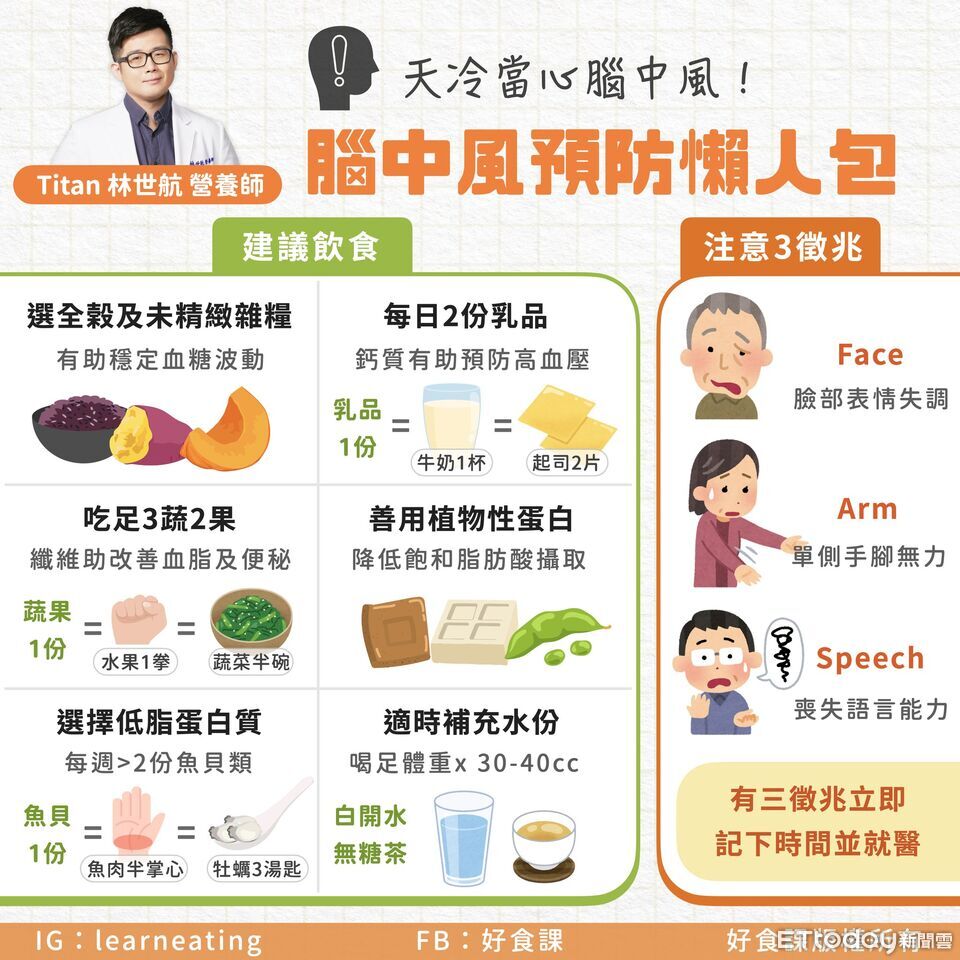 天氣一冷,除了血壓容易升高,也是心血管疾病的高峰期!對此,營養師指出,腦中風也可以透過「6大飲食」來預防,包括「全穀及未精製雜糧、每日2份乳品、善用植物性蛋白」等。