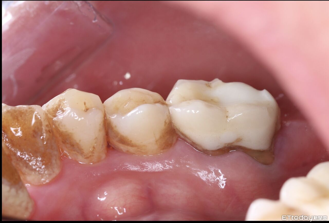 ▲女患者未確實清潔牙齒,除了牙齒上有深色茶漬外,牙齒底部有明顯的牙菌斑。(圖/恩主公醫院提供)