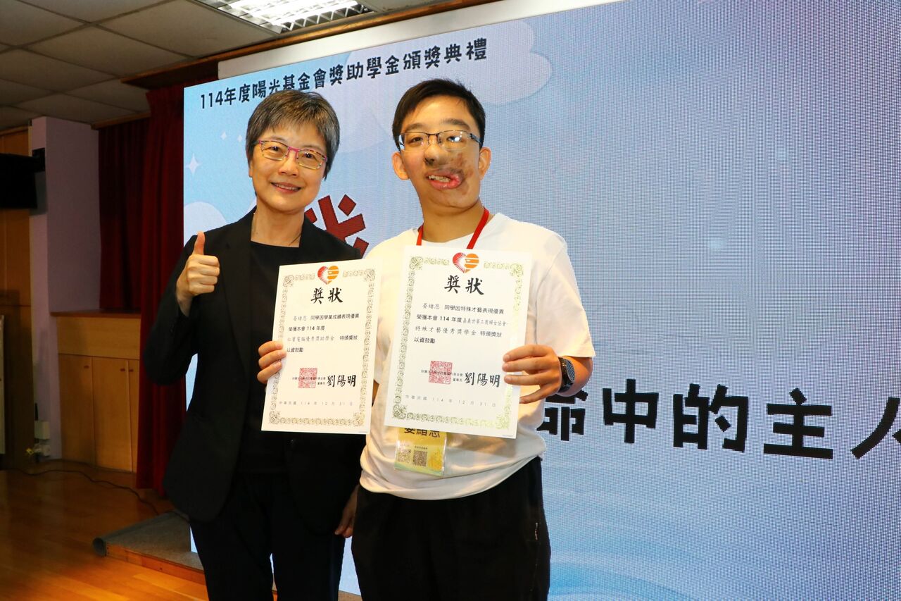 ▲晏緒恩獲陽光基金會執行長舒靜嫻頒發獎學金表揚。(圖/陽光基金會提供,下同)