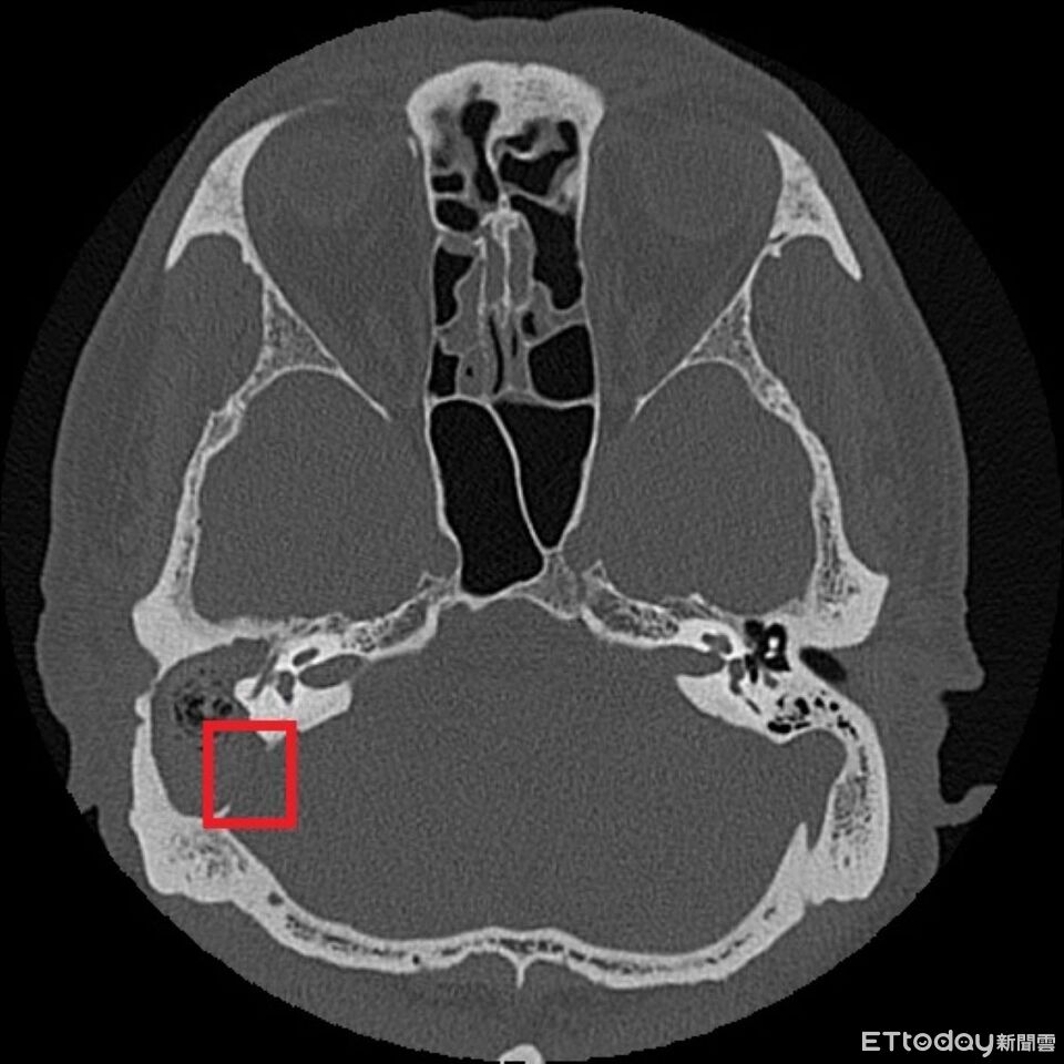 ▲從張先生的影像可看到與後顱窩相隔的骨板遭膽脂瘤侵蝕(紅框處)。(圖/台北慈院提供)