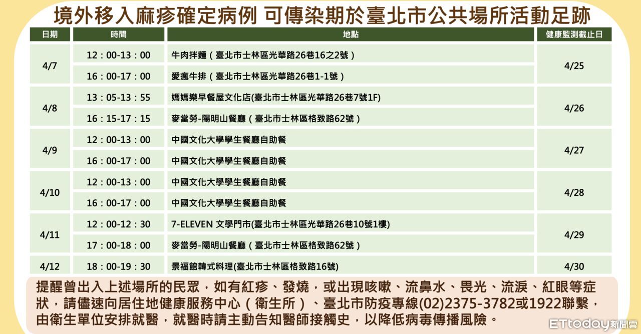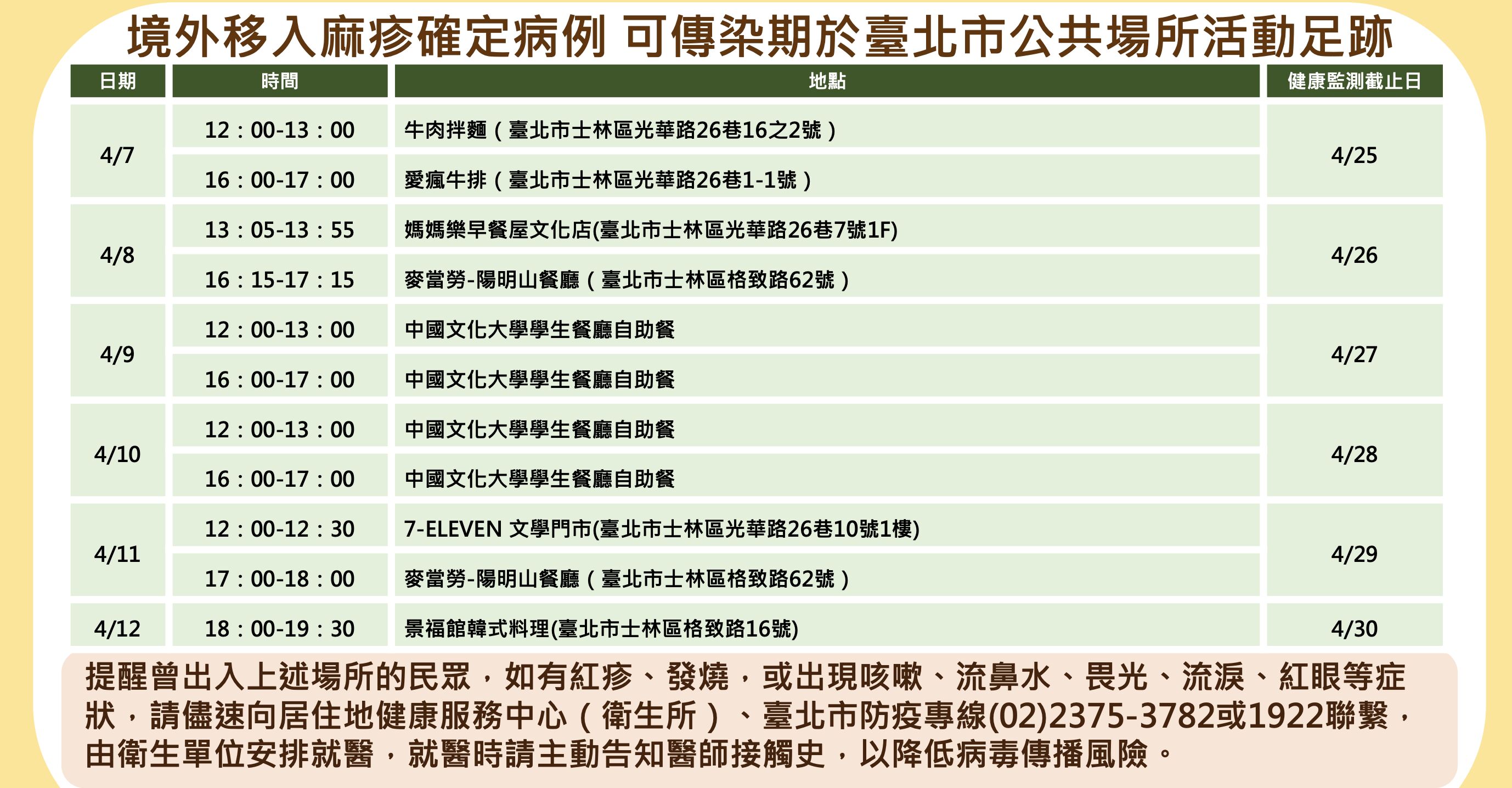 北市衛生局疾管科科長余燦華說明,個案是外籍大學生,可傳染期間有公共場所活動史,相關場域均已加強清消,提醒曾與個案足跡重疊者,請進行自主健康監測至4月30日。