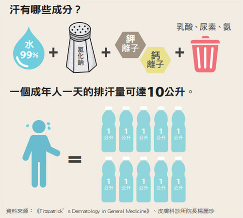 長庚紀念醫院皮膚科兼任主治醫師楊麗珍說,汗的成分大多是水,其餘則是氯化鈉、乳酸、鉀、鈣、尿素、氨(俗稱阿摩尼亞)、胺基酸,以及很好的抗菌肽,這些物質都會從汗液中排除,促進新陳代謝。
