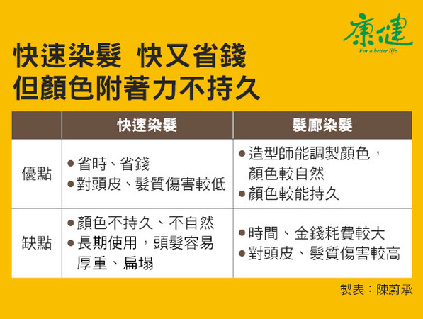 快速染髮的優點是清洗方便,且使用藥水較少,對頭皮、髮質的傷害及過敏嚴重性較髮廊染髮低,而且需要的價格、時間較少。省了時間和金錢,但效果有差別。快速染髮的顏色附著力較弱、選擇較少、無法調色,跟髮廊相比,顏色較不自然,「偶爾使用沒問題,但常常使用一定會造成毛囊阻塞,」周明輝說。臺安醫院皮膚科主任曾德朋也認為,許多人因為好染好清洗就反覆染髮,這樣反而傷害更大。
