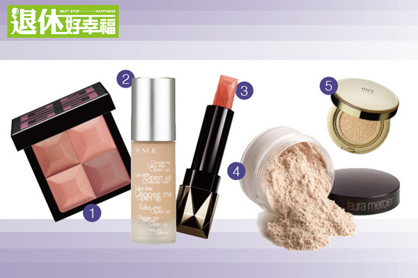 1.Givenchy魅力幻彩腮紅盤 2.RMK水凝柔光粉霜 3.肌膚之鑰薔薇唇 4.lauramercier柔光透明蜜粉 5.IOPE水潤光感舒芙蕾粉凝乳RX。